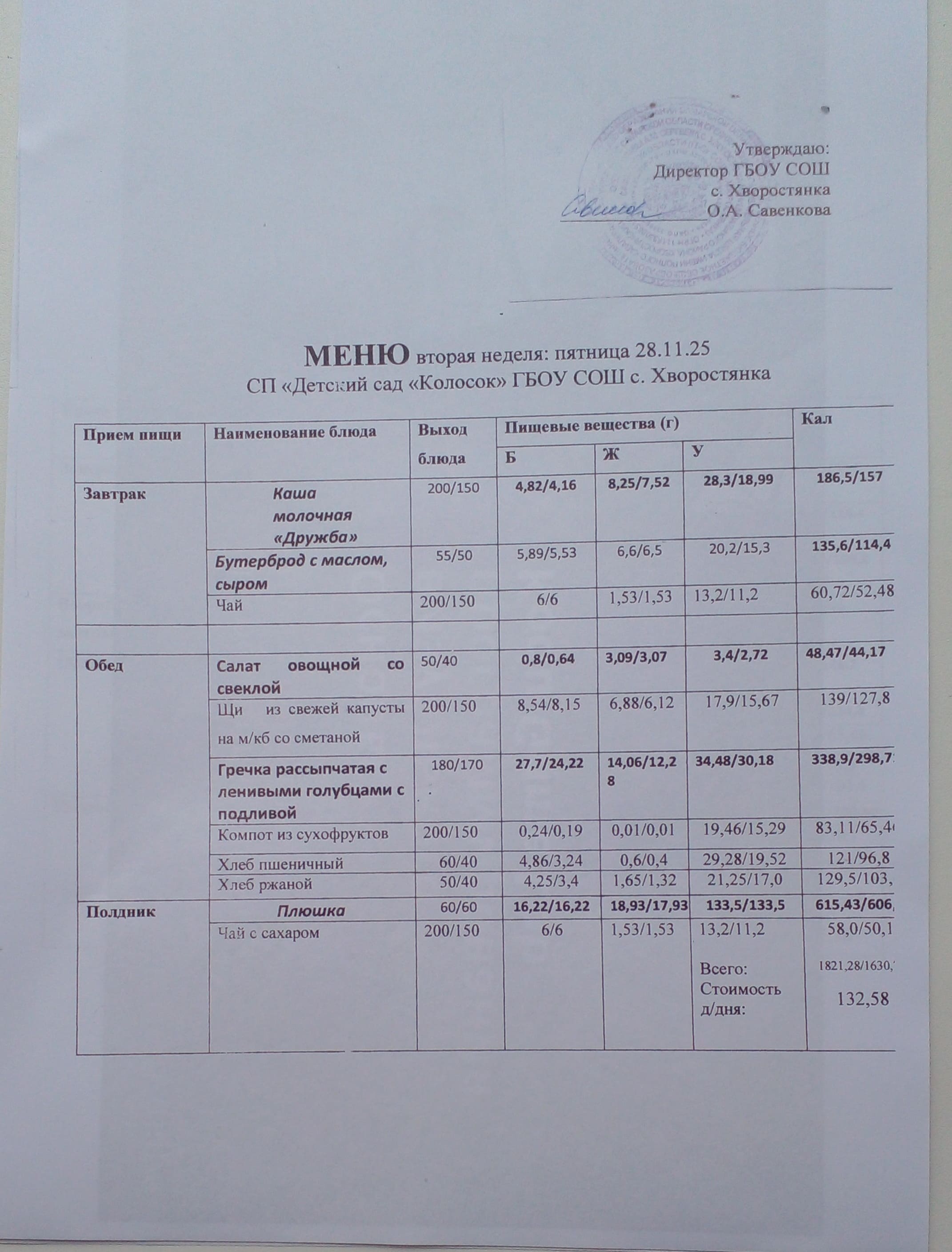 Утвержденное ежедневное меню: соответствует 10-ти дневному меню. Информация для родителей вывешивается на информационных стендах ежедневно.